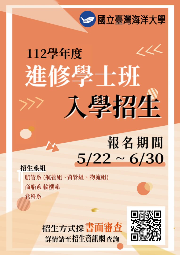 說明:一、本校112學年度進修學士班入學招生訂於112年5月22日(星期一)至112年6月30日(星期五)止受理網路報名。二、招生學系及名額請詳見本校招生簡章,招生簡章下載及相關訊息請至本校招生資訊網頁查詢, 網址:(https://admission.ntou.edu.tw/)。三、招生諮詢服務請洽本校進修推廣組,聯絡電話:(02)24622192分機1200~1204。