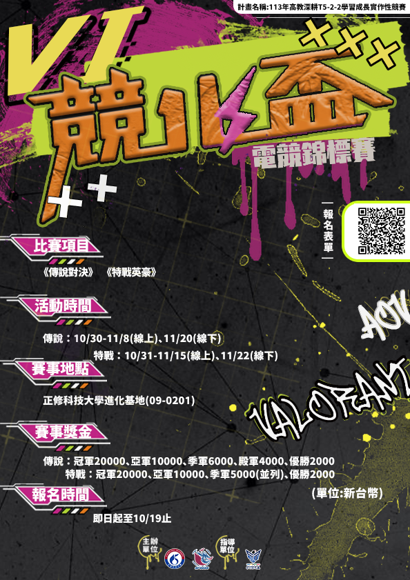 一、本次電競賽將於113年10月31日至11月22日舉行,報名隊伍上限為32隊,需同校組隊(每校可多隊報名),敬請貴校師長協助組隊。