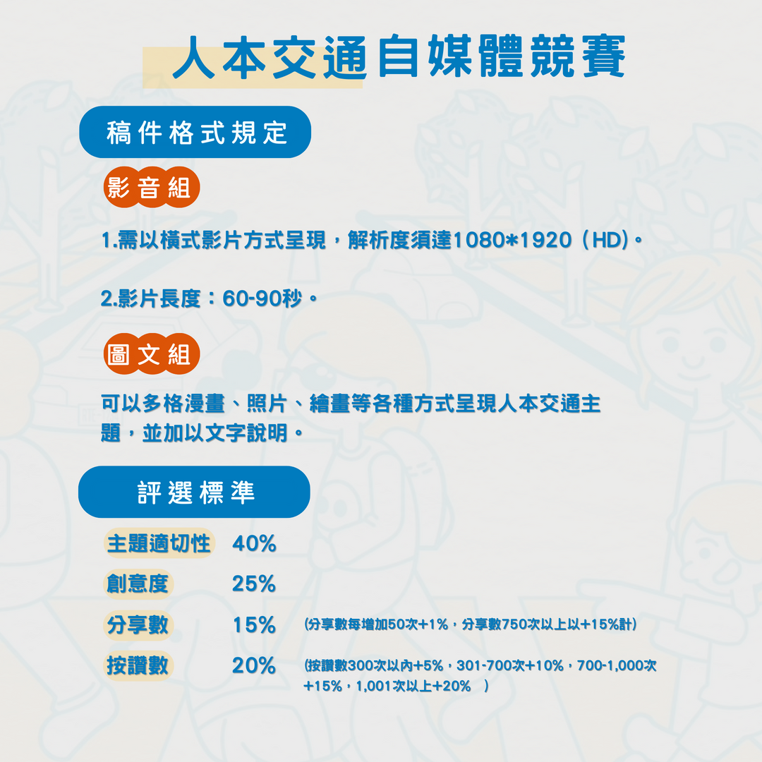 一、依據苗栗縣政府113年10月23日府工程字第1130230111號函辦理。二、旨案活動為鼓勵參賽者透過創意發想推廣人本交通議題,請協助轉知所屬踴躍參加。三、活動海報如附,競賽相關細節請參閱活動報名網址:https://forms.gle/9ixywwXv8n22JHvK8。