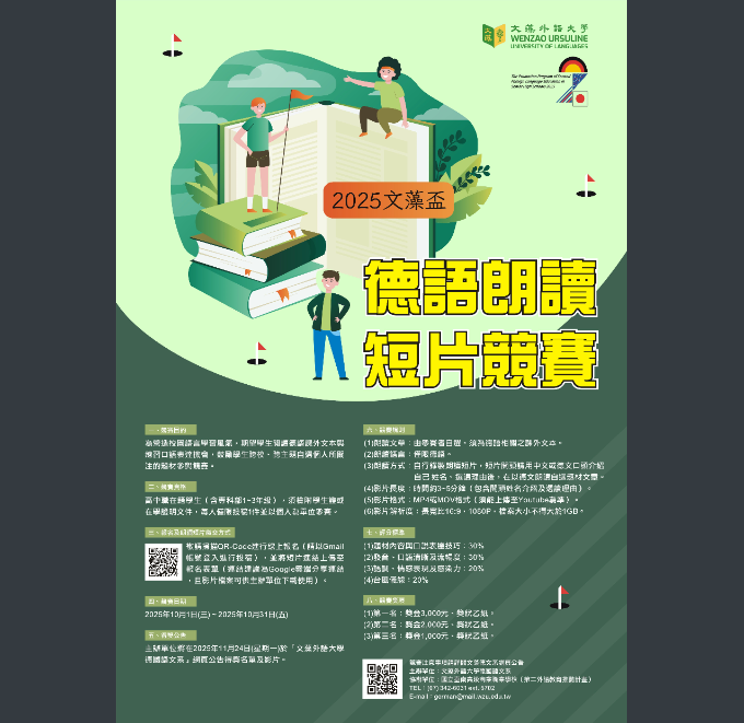 一、為提升學生學習德語之興趣與風氣,本系與國立臺南高級商業職業學校聯合辦理「2025年文藻盃德語朗讀短片競賽」,鼓勵學生跨校、跨領域參與競賽。