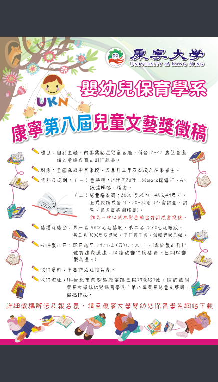 (三)報名注意事項與競賽規則詳如附件,或上康寧大學嬰幼兒保育學系(https://ecce.ukn.edu.tw/)下載。