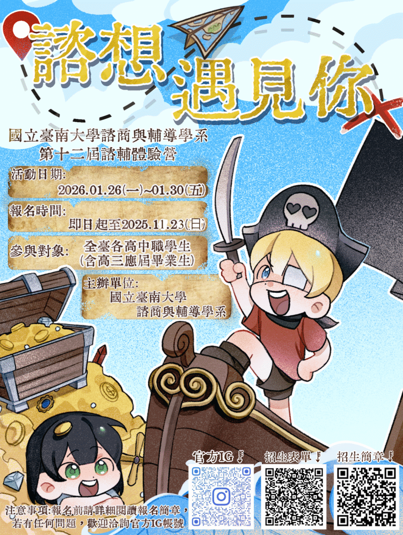 一、活動名稱:臺南大學第十二屆諮輔體驗營-諮想遇見你。