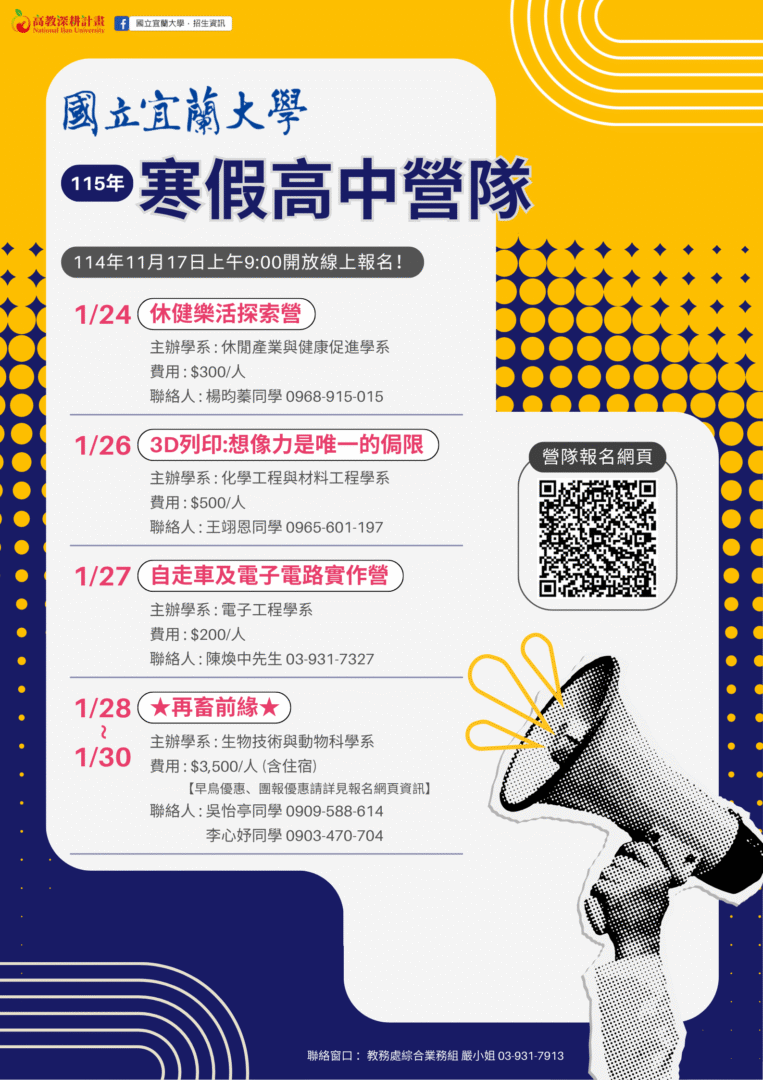 一、檢附活動海報乙份,完整訊息請至活動網站(網址:https://sites.google.com/ems.niu.edu.tw/115winter),或由國立宜蘭大學首頁(網址:https://www.niu.edu.tw)/招生資訊/在宜大夢想起飛/高中營隊查詢。