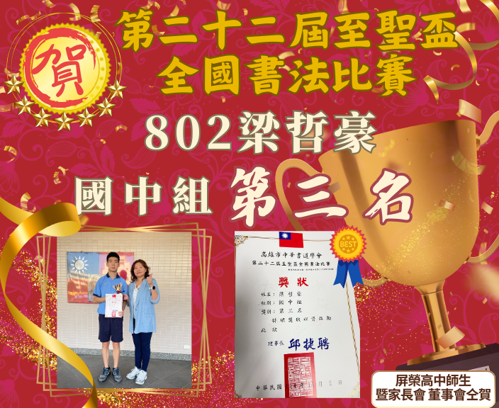 賀!第二十二屆至聖盃全國書法比賽榮獲國中組第三名