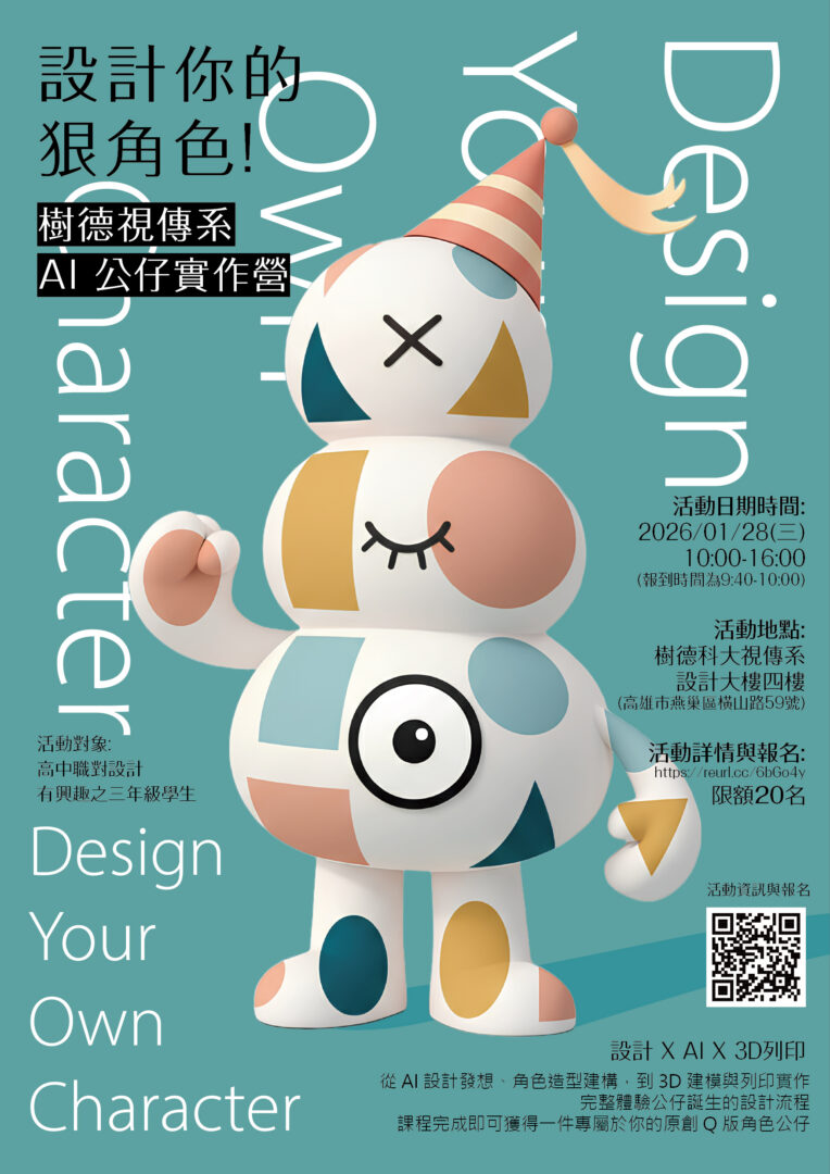 一、本校視覺傳達設計系寒假冬令活動營「AI公仔實作營」,從AI設計發想、角色造型建構,到3D建模與列印實作,完整體驗公仔誕生的設計流程,課程完成即可獲得一件專屬於你的原創Q版角色公仔,活動一律免費並發給研習證書。
