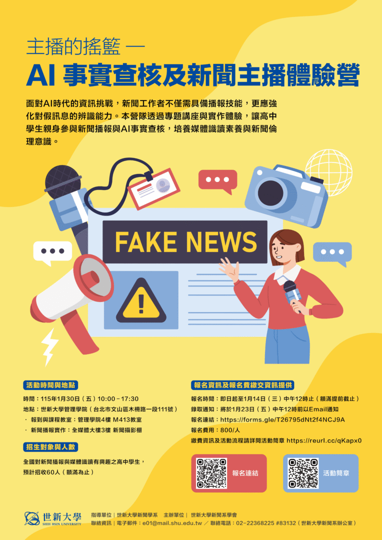 一、為提升高中學生對媒體識讀與假新聞辨識之能力,本系系學會特辦理「主播的搖籃—AI事實查核及新聞主播體驗營」,邀請對新聞傳播、媒體識讀或AI應用有興趣之學生參與。