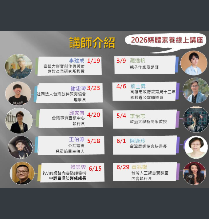 三、有關「115年中小學媒體素養主題式線上講座」課程表已詳列10場次之辦理日期及時間、線上連結網址、講座內容簡介等資訊,請貴局(府)協助將旨揭課程表以電子公告方式週知,並鼓勵教師自由參加(免報名)。配合簽到及完成該場次線上講座之教師,將取得1小時研習時數。