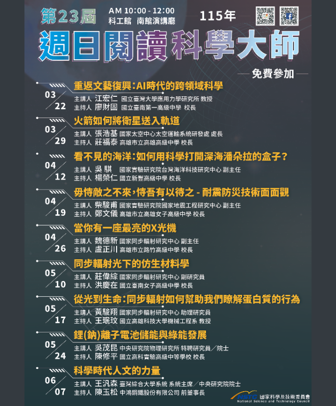 二、115年3月至6月份講座場次表及海報,如附件,演講地點於國立科學工藝博物館南館演講廳,每場講座亦核發參加教師2小時研習時數,以及參加公務人員核予2小時進修時數,本講座亦提供現場直播,歡迎透過週日閱讀科學大師官網http://science.nchc.org.tw/web即時收播。