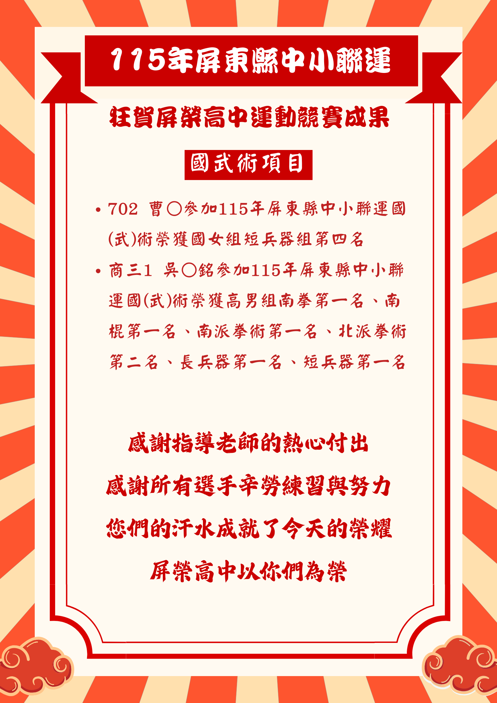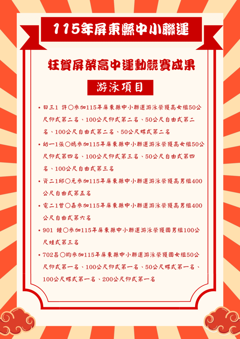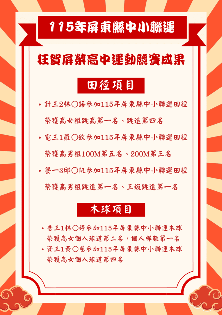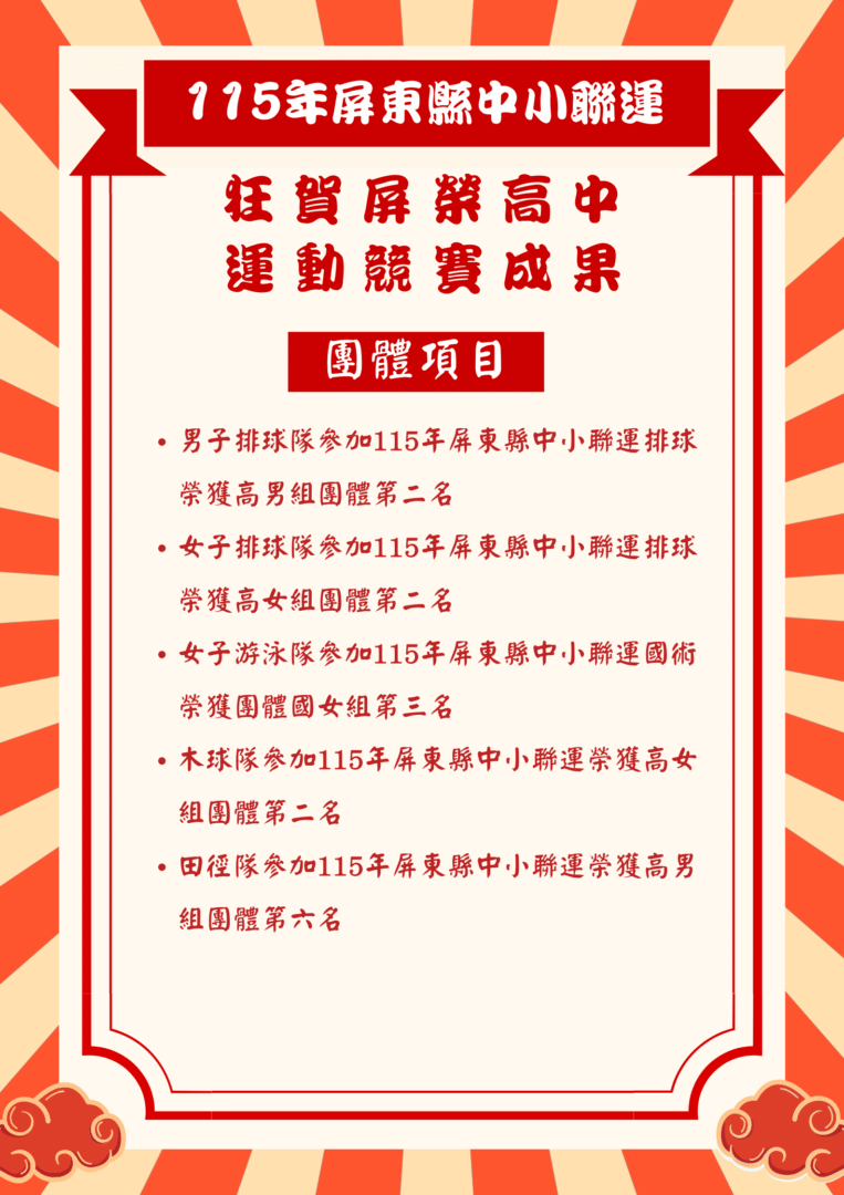 狂賀!屏榮高中各代表隊選手參加115年中小聯合運動會榮獲佳績