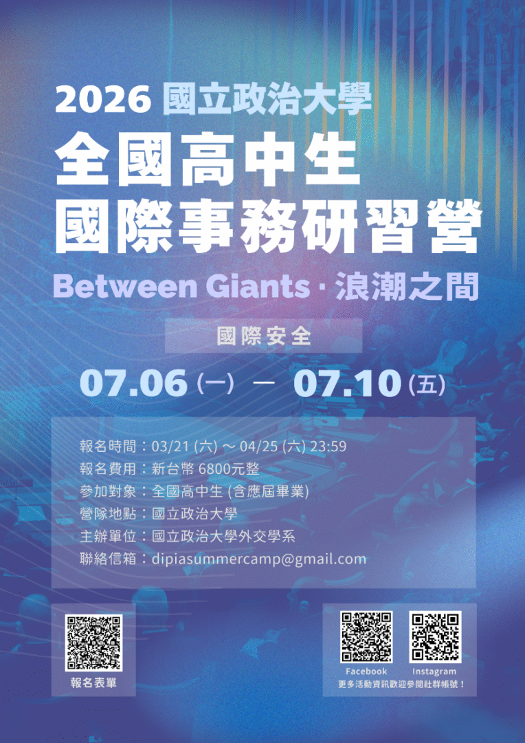 三、檢送活動海報電子檔,可自行影印使用,敬請惠予協助宣傳並鼓勵學生踴躍參加。相關活動資訊請上活動頁面查詢:https://www.instagram.com/nccudip_iasc? igsh=NmhseXgxdGRjbTFo&utm_source=qr,或IG搜尋「2026政大外交國際事務研習營」。https://www.facebook.com/share/1Aoi7ajNSf/?mibextid=wwXIfr或FB搜尋「全國高中生國際事務研習營」。