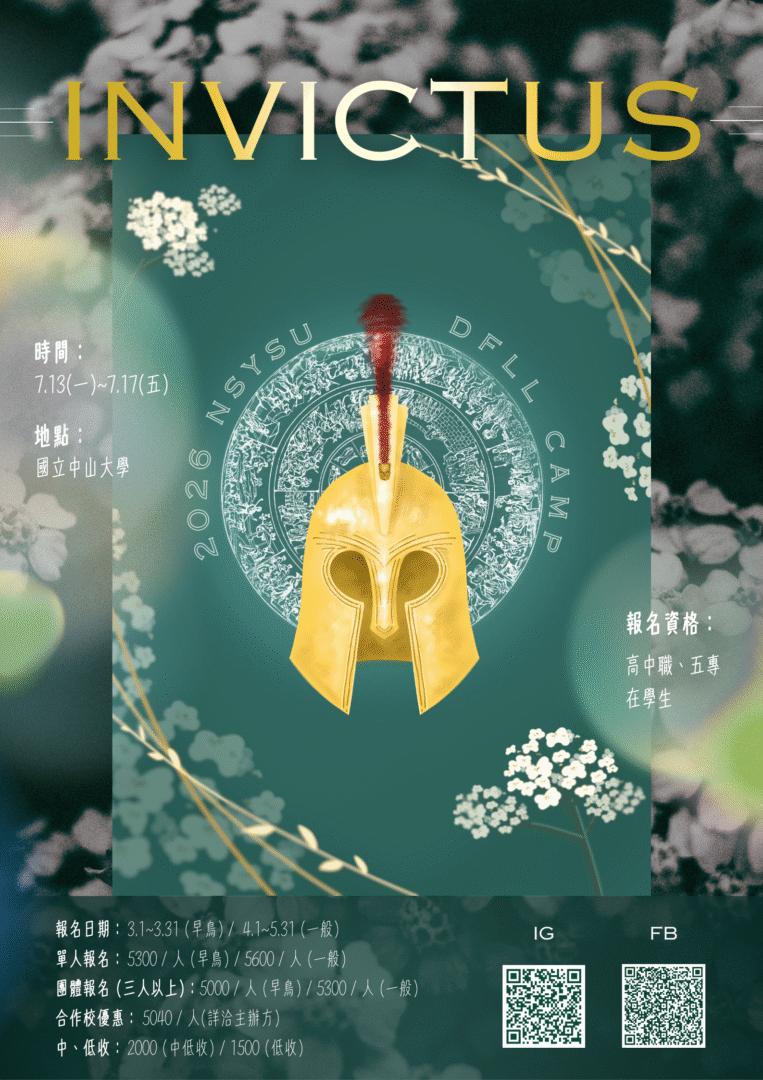 (六)FB粉絲專頁「2026 中山外文營 Invictus 」https://www.facebook.com/share/18SdZJBo7E/?mibextid=wwXIfr