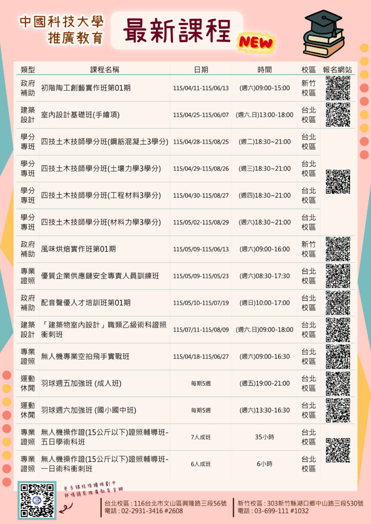 四、課程詳細資訊請掃描海報所附QR Code,或逕至本校推廣教育中心官方網站查詢(https://cec.cute.edu.tw/)。