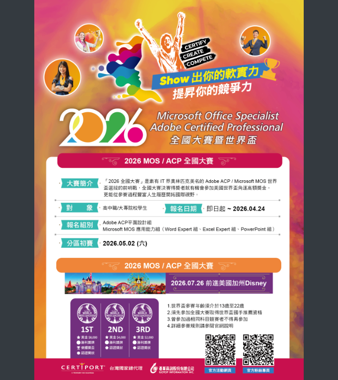 三、「2026 Microsoft MOS / Adobe ACP World Championship世界盃競賽」係由全球最知名科技巨擘Microsoft、Adobe與IT專業認證服務商Pearson VUE/Certiport主辦,去年共有來自108個國家,超過200,000名選手參與本國際賽事,角逐世界冠軍寶座。