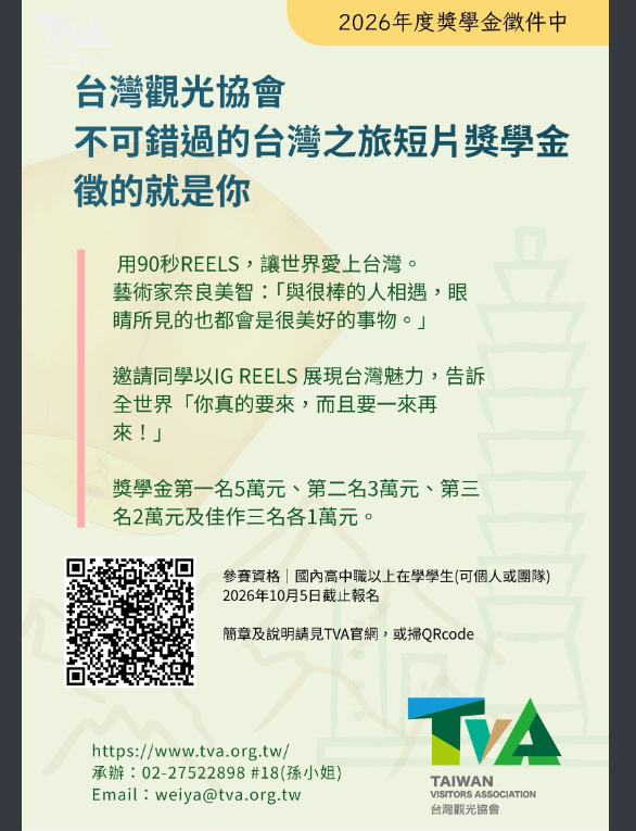 2026年財團法人台灣觀光協會2026年度「不可錯過的台灣之旅短片獎學金」