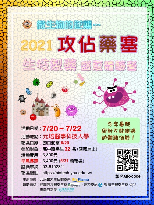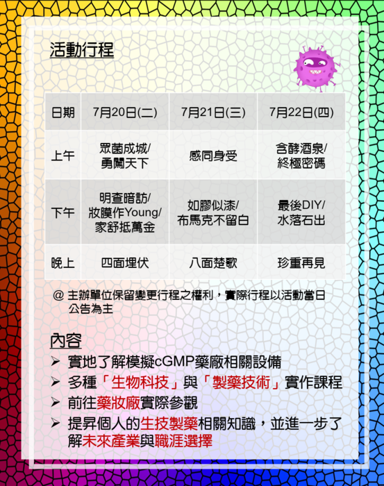 一、活動目的:讓高中職學生體驗生物科技與製藥技術在生活中的應用,並激發學生對生物科技與製藥技術的興趣。